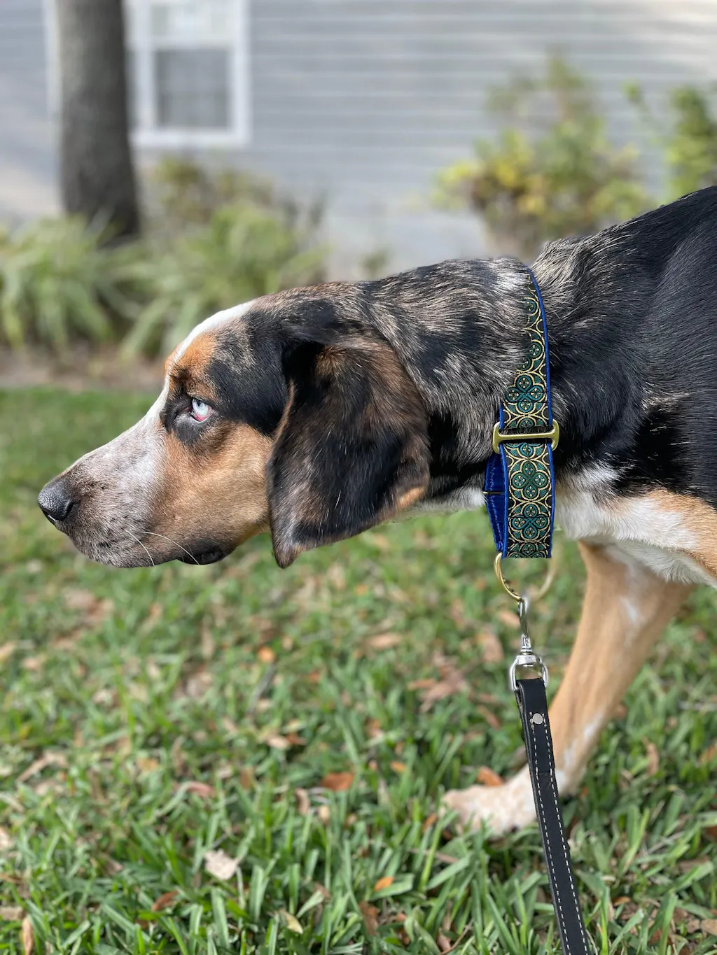 Available as a martingale dog collar or a regular side-release buckle dog collar, this Celtic-inspired 1.5" collar features a jacquard ribbon design in green, teal, and metallic gold on a black background. We fully wrap the polypropylene webbing core of this collar in royal blue flannel-backed satin to ensure your dog's comfort and help prevent matted fur.