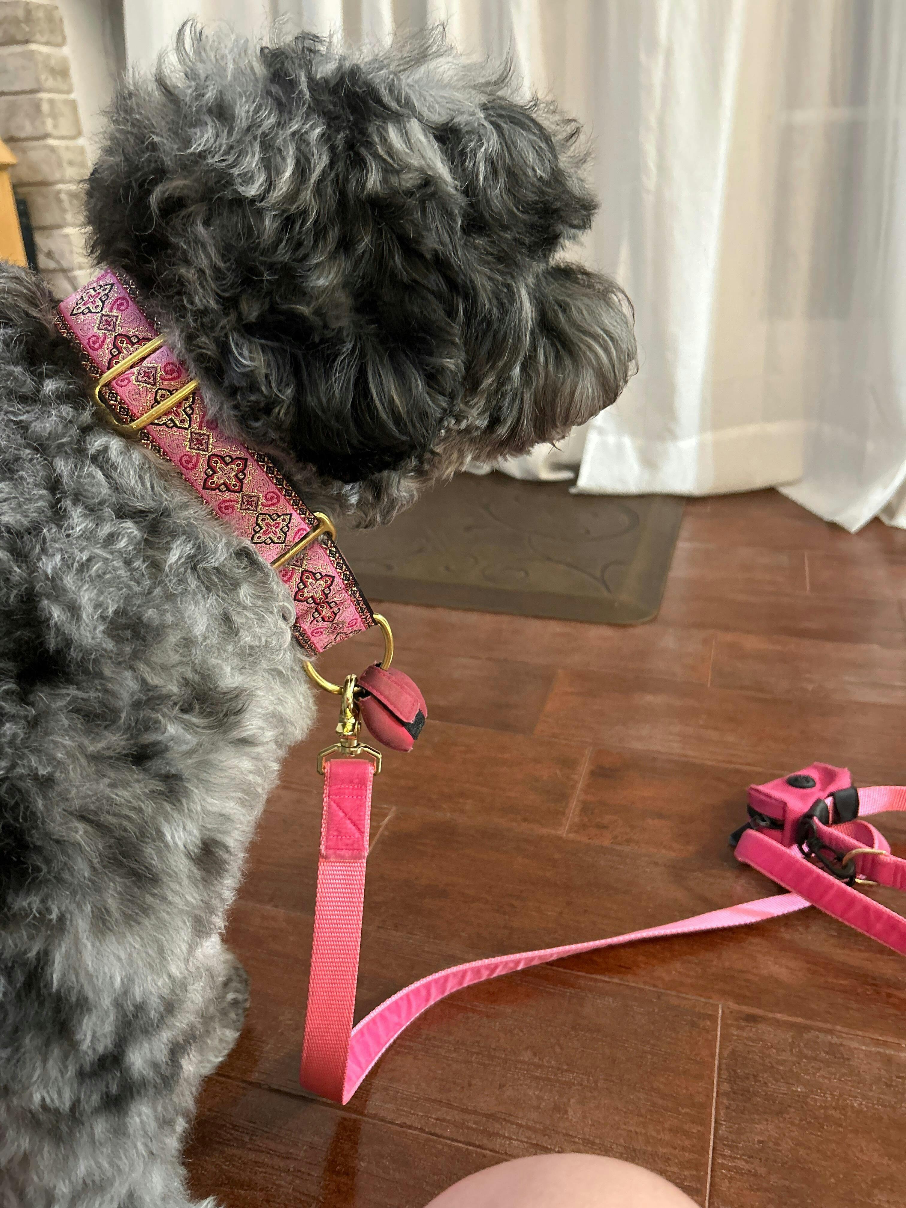 This pink dog leash is constructed with 1" wide nylon. Buyer may select one of the following leash clasps: nickel-plated bolt snap, nickel-plated trigger snap, or brass trigger snap.